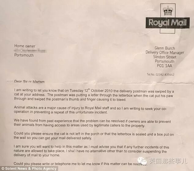 于是皇家邮政傲娇地发了如此正式的一封信通知房主,“你必须解决这个问题,要不我们就再也不派邮递员去你家送信了哼!╭(╯^╰)╮”