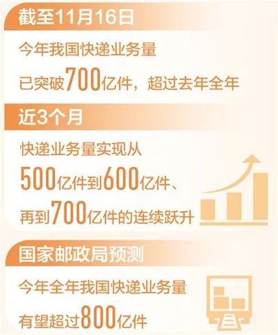 700亿件!国家邮政局监测数据显示:截至11月16日,今年我国快递业务量已超700亿件,超过去年全年。近3个月,快递业务量实现从500亿件到600亿件、再到700亿件的连续跃升。